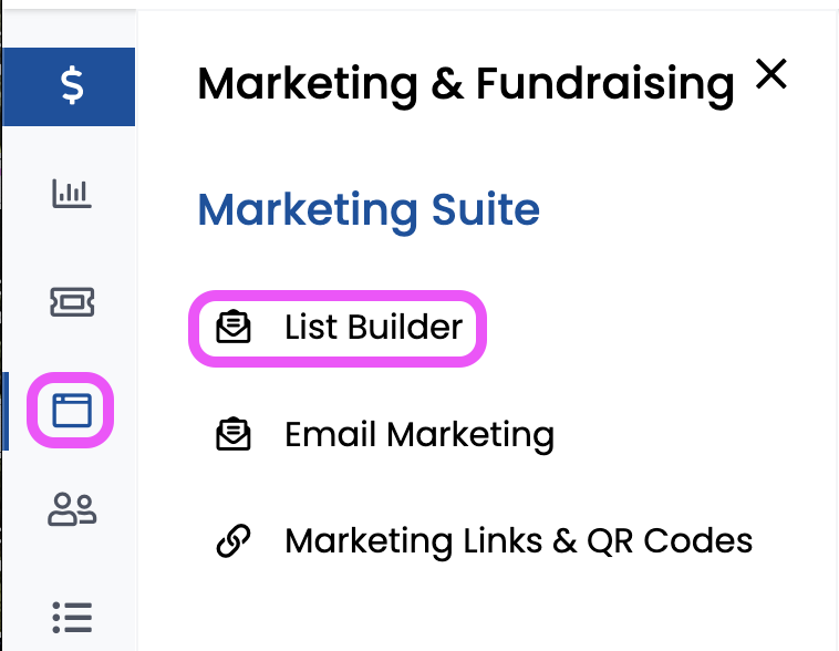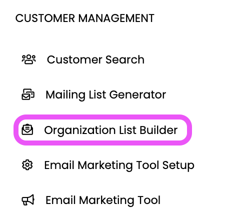 2. On the left side menu, under Customer Management→ ORGANIZATION LIST BUILDER.