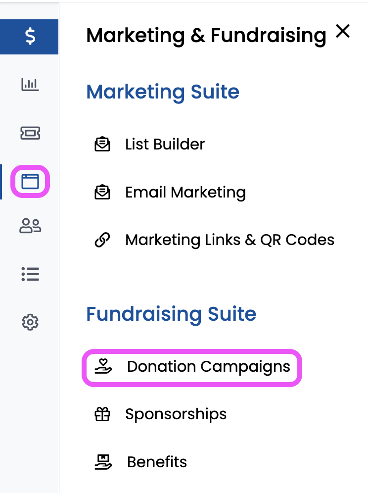 2. On the left side menu, go to Marketing and Fundraising → DONATION CAMPAIGNS.