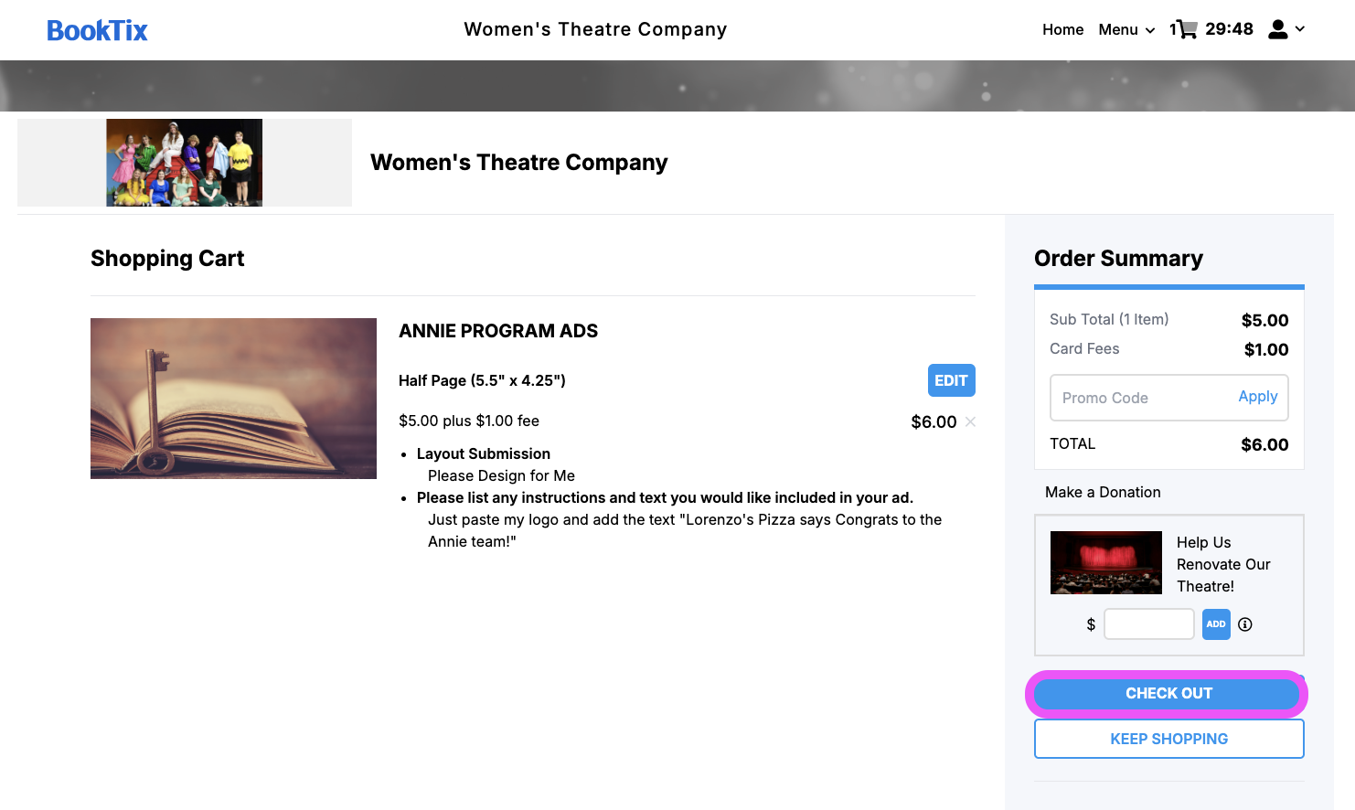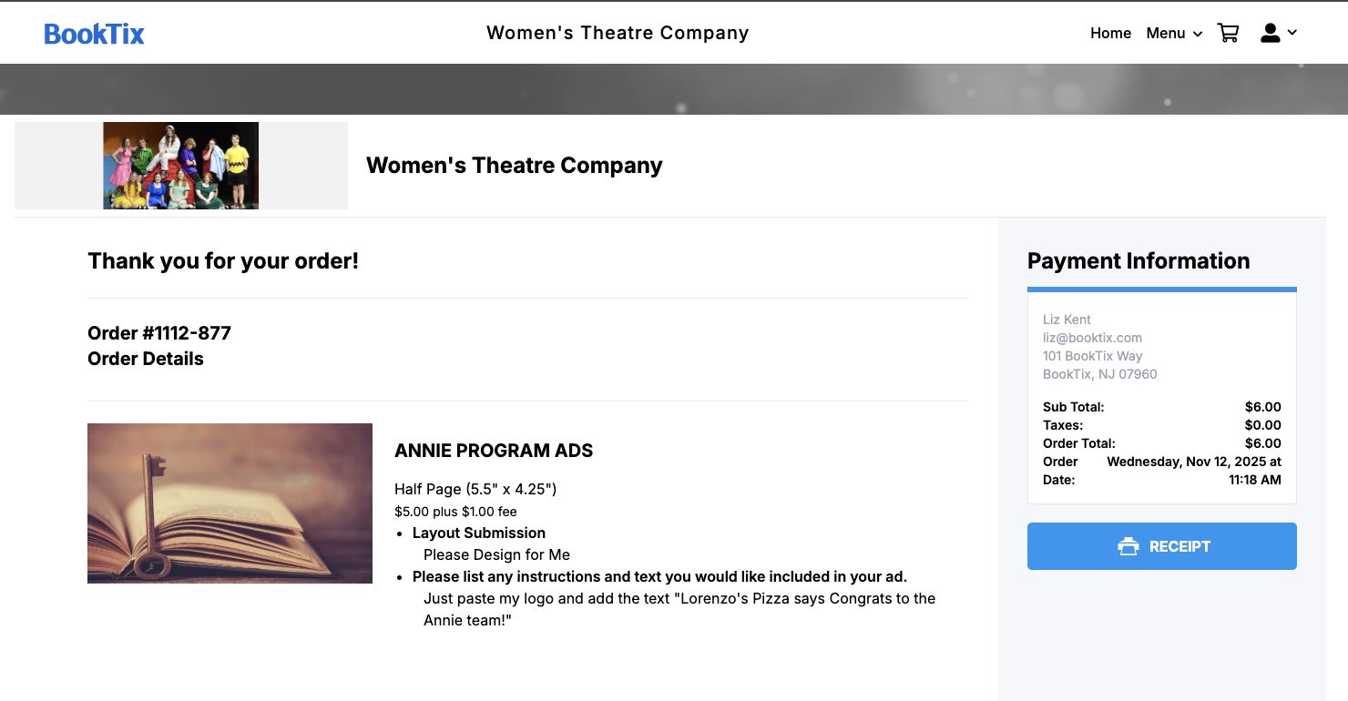 And your order is complete! Your program ad has been purchased and your details submitted to the organization. They will reach out should they need anything else!