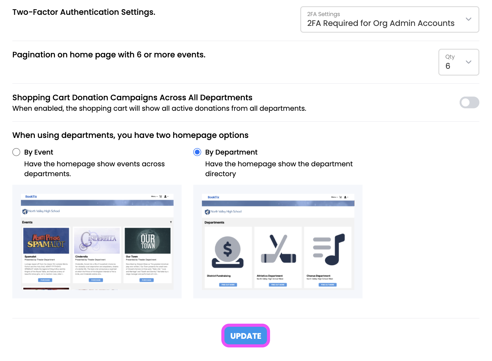 If you are requiring 2FA in any capacity on your BookTix account, you should notify your admins of this change. We recommend providing them with a link to our article detailing the steps for enabling 2FA: Enabling Two-Factor Authentication