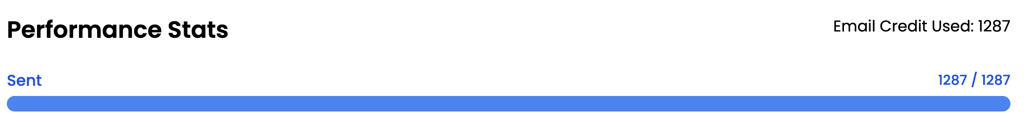 Under PERFORMANCE STATS, the SENT bar shows the sending progress as well as the number of Email Credits Used.