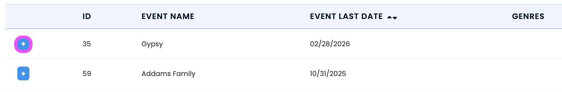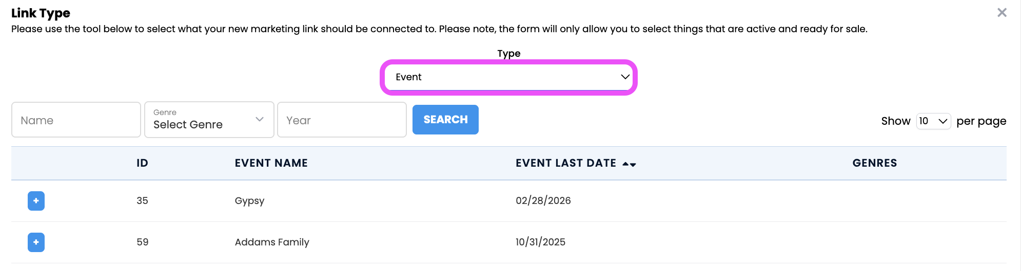 If you are searching for an EVENT, you can narrow your search by Name, Genre, or Date, then click SEARCH: