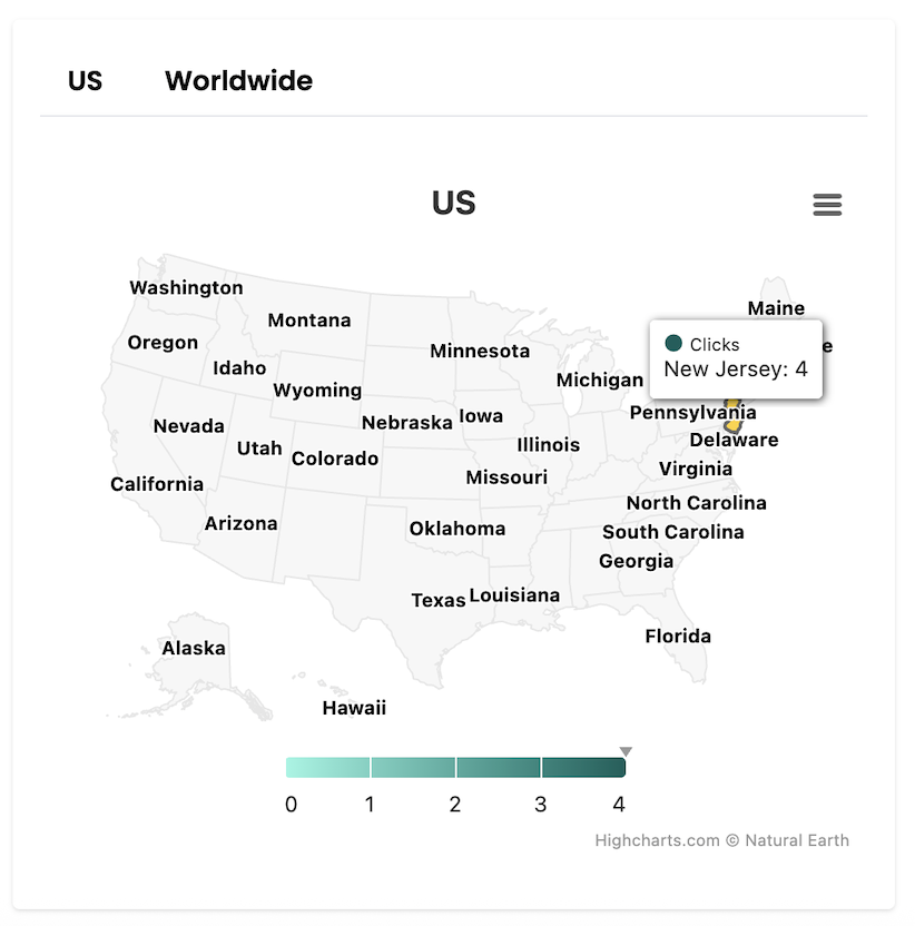 Geographic data: a map view showing clicks worldwide or by U.S. state.