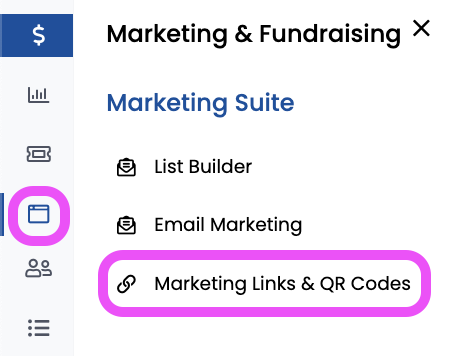 - On the left side menu, go to Marketing and Fundraising → MARKETING LINKS & QR CODES.