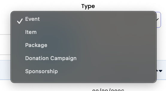 Under Type, select the event, item, package, donation, or sponsorship you want to promote.